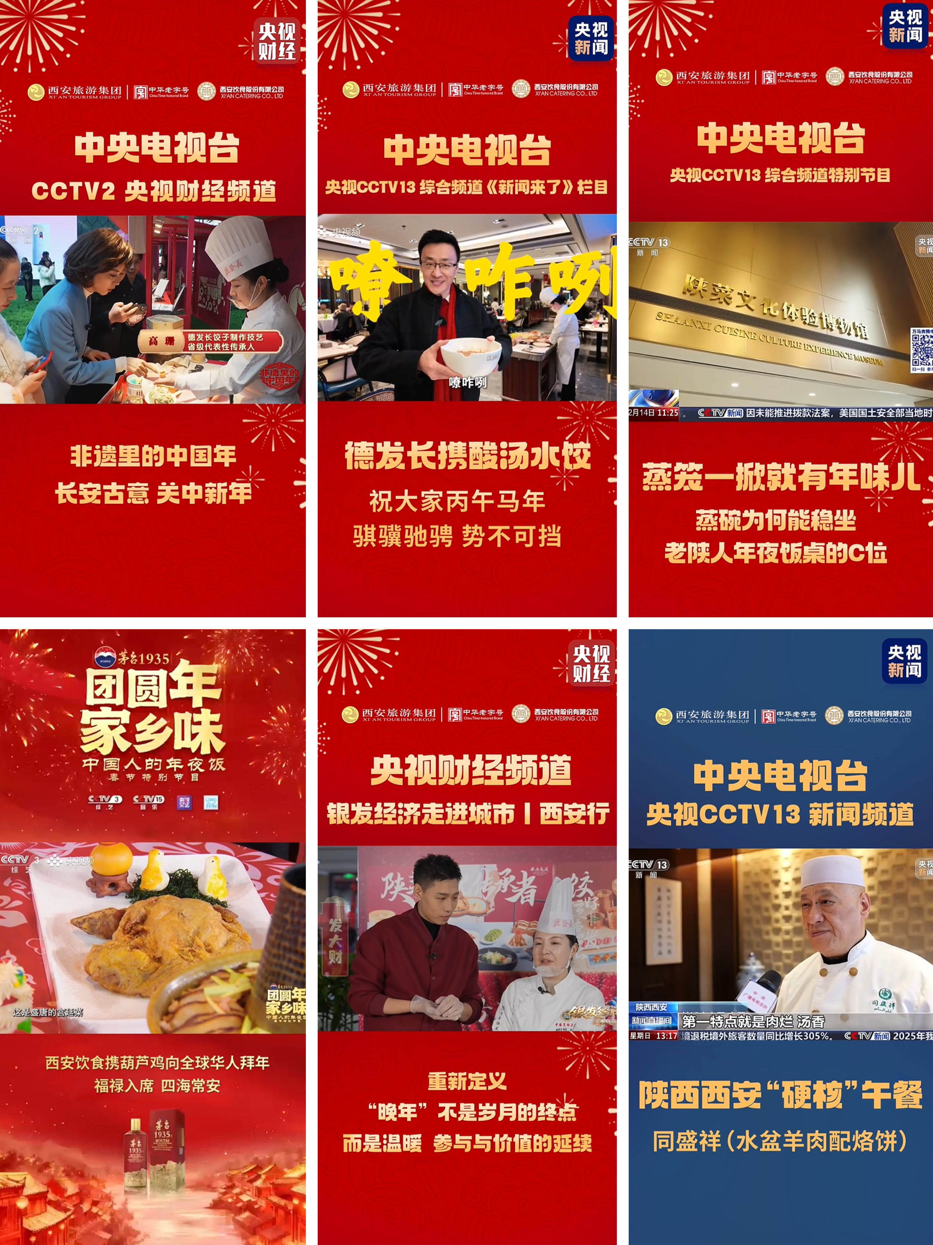 春節(jié)期間,西安飲食獲央視六大欄目多次報道,同盛祥水盆羊肉、西安飯莊葫蘆雞等亮相《我的午餐》《團圓年家鄉(xiāng)味》等節(jié)目;德發(fā)長餃子技藝于《非遺里的中國年》展示,并在除夕央視春晚倒計時環(huán)節(jié)向全國觀眾拜年。新華社刊發(fā)《老字號闖新路》,聚焦陜菜文化體驗博物館,全網傳播量超180萬;中國新聞網報道《八道蒸碗真豪情 關中“硬菜”迎客來》,獲國際媒體轉載,助推陜菜文化出海。《陜西日報》頭版頭條肯定其文化營銷創(chuàng)新,省市級媒體形成全媒體傳播矩陣,總瀏覽量破億。